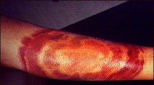 - Наличие большой, красной, растущей сыпи, по виду похожей на «бычий глаз»