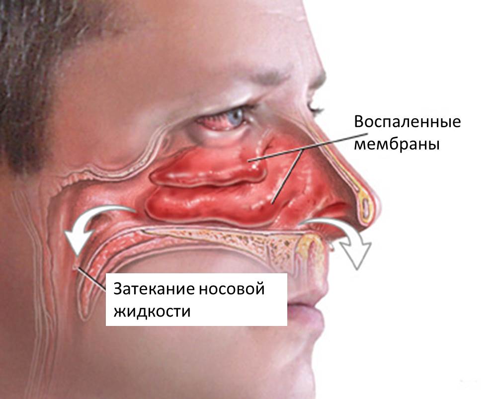Насморк и чувство заложенности носа могут возникнуть при простуде, аллергии, инфекции пазух носа или гриппе. При избыточной секреции (выработки) слизи возникает насморк. Иногда возникает дополнительная выработка слизистого секрета в передней части носа или на задней стенке горла (постназальный синдром). Ощущение заложенности носа возникает при воспалении слизистой оболочки, выстилающей полость носа изнутри.