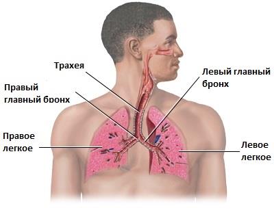 Воздух в легкие поступает следующим образом: трахея делится на главные бронхи, которые вплетаются в легкие, разветвляются (бронхиальное дерево), правый главный бронх образует три ветви, а левый — две. Далее ветви делятся в следующем порядке: ветви - средние бронхи - мелкие бронхи – дыхательные бронхиолы - альвеолярные ходы, каждый из которых заканчивается альвеолярными мешочками. Стенки альвеолярных ходов и мешочков состоят из альвеол (пузырьки). Именно в альвеолах происходит обмен кислородом и углекислым газом между кровью и поступившим извне воздухом.