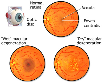 Macular degeneration is a disease of the retina that affects the macula in the back of the eye. The macula is important for clear central vision, allowing an individual to see fine details. There are two types of macular degeneration, dry and wet. Dry macular degeneration is more common and is characterized by the thinning of the retina and drusen, small yellowish-white deposits that form within the retina. The dry form of macular degeneration is usually mild. Wet macular degeneration can happen more quickly and be more serious. It occurs when vessels under the retinal layer hemorrhage and cause the retinal cells to die creating blind spots or distorted vision in the central vision. The disease becomes increasingly common amongst people in each succeeding decade over 50.