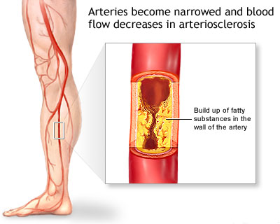 Peripheral artery disease is caused by arteriosclerosis, or "hardening of the arteries." This problem occurs when fatty material (plaque) builds up on the walls of your arteries. This causes the arteries to become narrower. The walls of the arteries also become stiffer and cannot widen (dilate) to allow greater blood flow when needed.