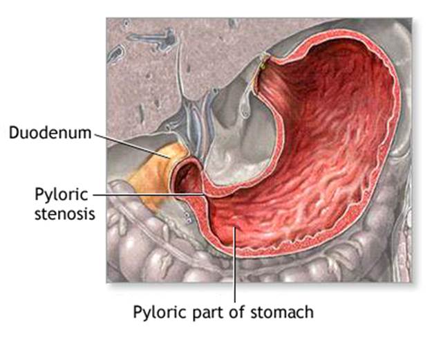 Normally, food passes easily from the stomach into the first part of the small intestine through a valve called the pylorus. With pyloric stenosis, the muscles of the pylorus are thickened. This prevents the stomach from emptying into the small intestine.