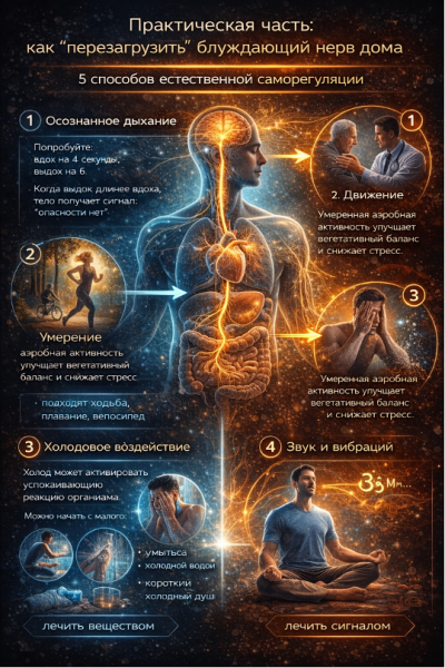 Блуждающий нерв — это не мистическая “кнопка спокойствия”. Это ограниченный по емкости, но высокоэффективный канал связи между мозгом и телом. Он регулирует дыхание, сердечно-сосудистую систему, иммунитет, воспаление — и тем самым становится одним из ключевых факторов здоровья и долголетия.