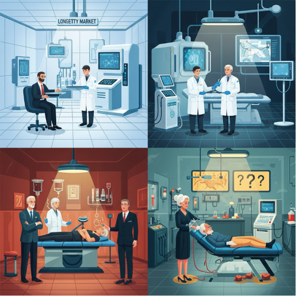 В наши дни по всему миру насчитываются тысячи клиник, специализирующихся на продлении жизни — от массовых до элитных, включая престижную Mayo Clinic. Некоторые из них предлагают недельные программы стоимостью до 50 000 долларов. Появились и «отпуска долголетия» с внутривенными инфузиями, «Олимпиады омоложения», эксклюзивные медицинские клубы вроде Fountain Life, предлагающие точную диагностику в формате загородного клуба, и фитнес-центры, сочетающие физическую нагрузку с антиэйдж-терапией.