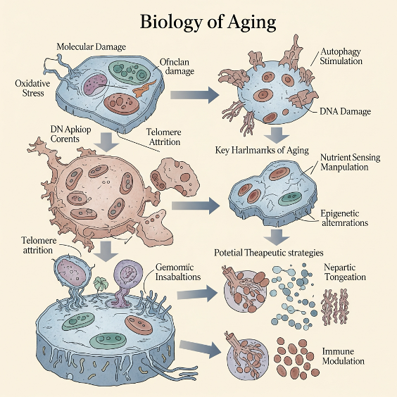 Старение — это сложный биологический процесс, который традиционно рассматривается как накопление молекулярных и клеточных повреждений с течением времени. Эти повреждения подрывают стабильность и функциональность организма, постепенно снижая его способность поддерживать гомеостаз - постоянство внутренней среды организма. Современные представления о биологии старения основываются на выделении ключевых признаков — биологических маркеров, которые не только усиливаются с возрастом, но и, как показывают исследования, активно способствуют старению. Более того, вмешательство в эти процессы способно замедлить или даже частично обратить биологическое старение.