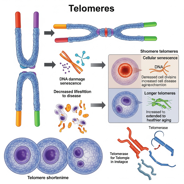 Теломеры — это повторяющиеся участки ДНК на концах хромосом, выполняющие роль защитных «колпачков». На протяжении всей жизни они постепенно укорачиваются в процессе клеточного деления — это часть естественного механизма старения, универсального для всех хромосом человека. Когда теломеры становятся слишком короткими, клетка теряет способность к делению и либо входит в состояние покоя, либо запускает апоптоз (самоуничтожение). Однако теломеры — это история, требующая деликатного баланса, настоящая «ситуация Златовласки»: слишком длинные — опасны, слишком короткие — тоже.