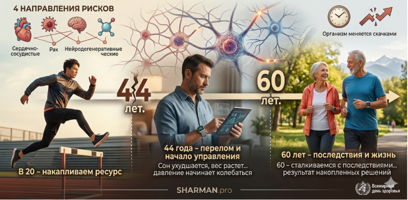 Сегодня понятно: это не совпадение. Возраст 40–45 лет — это один из ключевых биологических переломов. Меняется обмен веществ, ухудшается чувствительность к инсулину, растет нагрузка на сосуды.