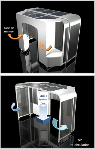 Операционные комнаты нуждаются в специальной системе вентиляции, обеспечивающей ламинарный поток стерильного воздуха. Такой поток обычно создается вентиляционной системой здания, однако, компания IMEX предложила мобильную систему, обеспечивающую стерильные условия практически в любом помещении. Конструкция данной системы состоит из алюминиевой кабинки, где чистота воздуха обеспечивается НЕРА фильтрами и направленным ламинарным потоком. Кабинка передвигается на колесиках и может быть собрана вокруг операционного стола, что позволяет независимым клинкам проводить операции в стерильных условиях, а также позволяет наблюдать за операцией , что полезно, например, при обучении студентов.Подготовил Адамбеков Шалкар по материалам статьи: Arc Sterile Turns Any Room into OR