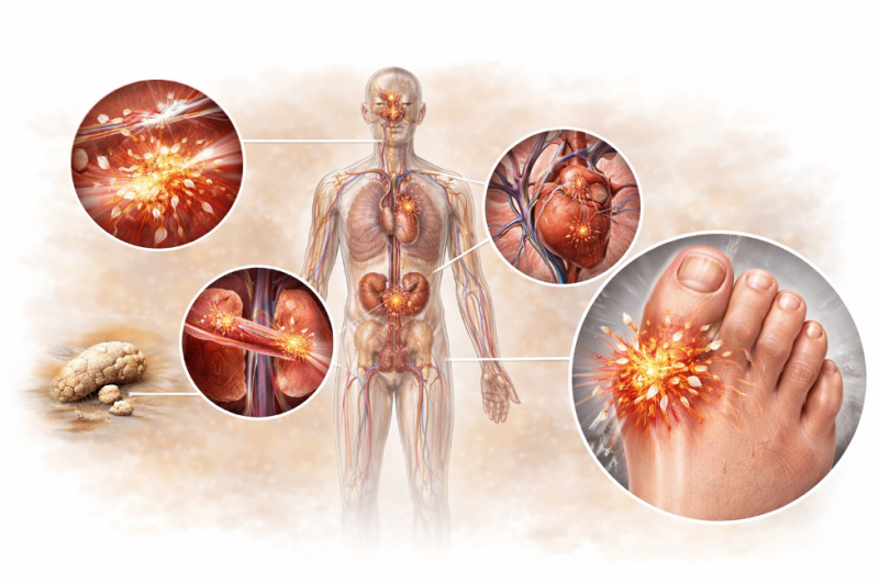 Именно поэтому подагра — это не только вопрос отдельных приступов боли. Это хронический процесс, который без лечения может приводить к структурным изменениям в организме.