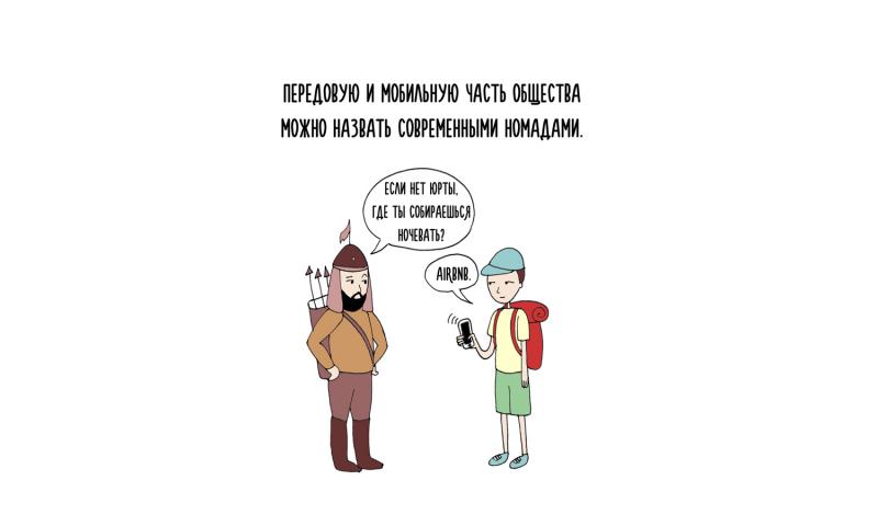 Как это ни странно, но мне видятся параллели между стилем быта миллениалов и образом жизни кочевников. Еще с древних времен наши предки-номады свободно перемещались по бескрайней степи, каждый раз открывая новые оазисы, общаясь и торгуясь с другими племенами и народами. Такие перспективы открывали безграничные возможности для творчества, предоставляя геополитические ареалы свободы, гуманизма и качественной жизни.