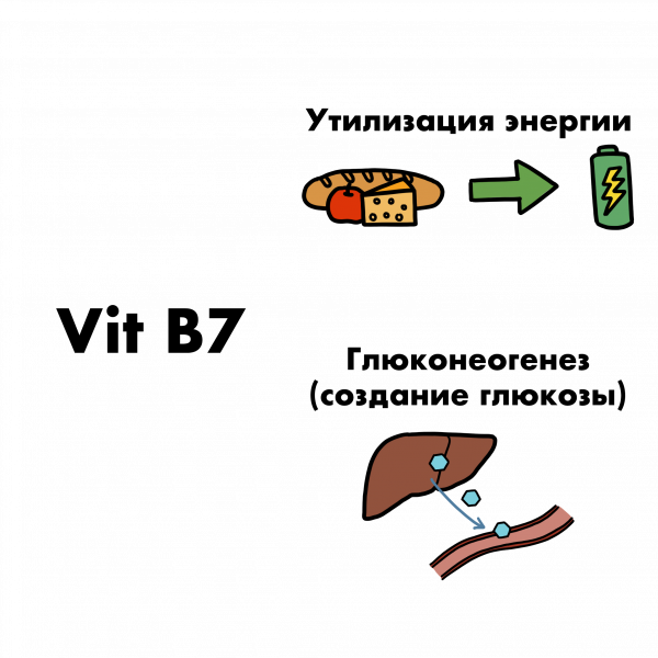 Биотин участвует в метаболизме белков, жиров и углеводов. Этот витамин является коферментом транскарбоксилаз, которые участвуют в процессе синтеза жирных кислот, аминокислот и глюконеогенеза (создании молекул глюкозы в организме).