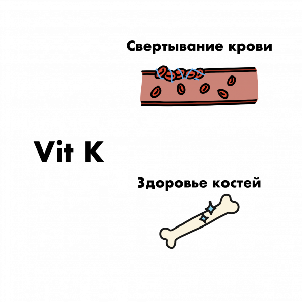 Витамин К участвует в процессе формирования протеинов, которые играют важную роль в свертывании крови и построении костей. Протромбин – это протеин, который зависит от витамина К, и напрямую участвует в процессе свертывания крови. Остеокальцин – протеин, который производит костную ткань, и тоже зависит от витамина К.